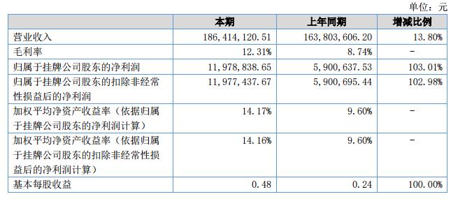 報告期內(nèi),公司營業(yè)收入186,414,120.51元,比上年同期163,803,606.20元增加了22,610,514.31,增幅為13.80%;本期營業(yè)收入毛利率為12.31%,較同期增加3.39個百分點(diǎn);本期實(shí)現(xiàn)歸屬于掛牌公司股東的凈利潤11,978,838.65元,較上年同期5,900,637.53元增加6,078,201.12元,增長103.01%。