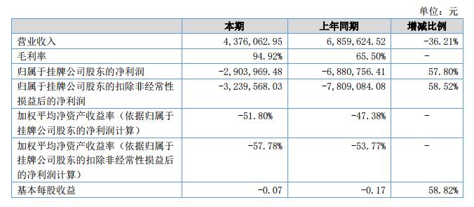 報告期內(nèi)公司實現(xiàn)營業(yè)收入437.61萬元,同比減少36.21%;實現(xiàn)凈利潤-290.40萬元,同比去年減虧57.8%。?