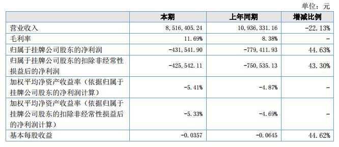 報告期內(nèi)公司營業(yè)收入851.64萬元,比上年同期減少22.13%;公司本報告期凈利潤為-43.15萬元,比上年同期增加了44.74%。