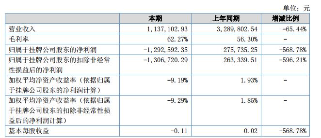報(bào)告期內(nèi)公司實(shí)際銷售收入113.71萬元,同比減少65.44%;實(shí)現(xiàn)凈利潤-129.26萬元。?