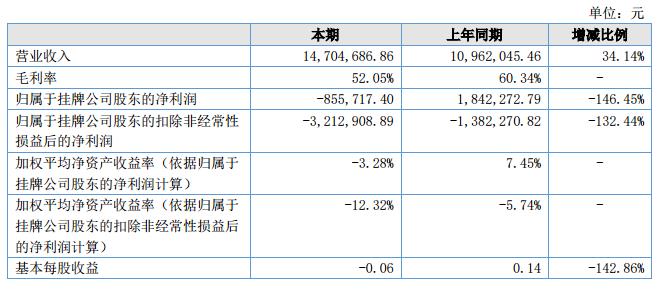 報(bào)告期內(nèi),營(yíng)業(yè)收入14,704,686.86元,同比上年增長(zhǎng)34.14%;增長(zhǎng)額3,742,641.40元;公司利潤(rùn)總額-859,370.26,同比上年減少150.40%。?