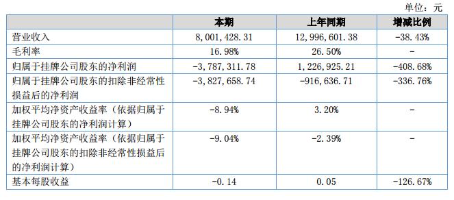 報告期內(nèi)公司主營業(yè)務(wù)收入合計(jì)800.14萬元,相比去年同期-38.43%;報告期內(nèi)實(shí)現(xiàn)凈利潤-378.73萬元,相比去年同期-408.68%,?