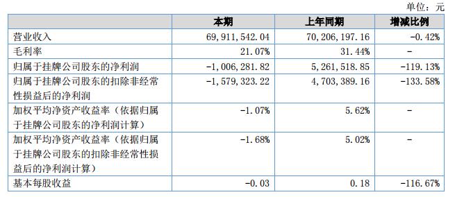 截至報告期末,公司總資產(chǎn)為206,944,008.45元,較期初減少8.75%;負債總額113,322,935.36元,較期初減少14.26%,歸屬于掛牌公司股東的凈資產(chǎn)為93,621,073.09元,較期初減少1.06%。報告期內,公司實現(xiàn)營業(yè)收入69,911,542.04元,較上年同期減少0.42%;實現(xiàn)歸屬掛牌公司股東的凈利潤-1,006,281.82,較上年同期下降119.13%。