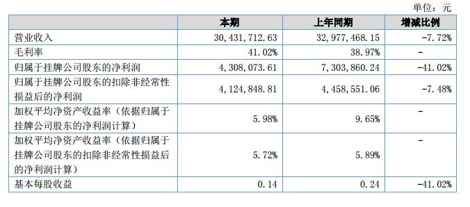 報(bào)告期內(nèi)公司實(shí)現(xiàn)營(yíng)業(yè)收入3043萬(wàn)元,比上年同期的3298萬(wàn)元減少了255萬(wàn)元,降幅為7.72%;公司實(shí)現(xiàn)凈利潤(rùn)430.8萬(wàn)元,比上年同期的730.4萬(wàn)元減少了299.6萬(wàn)元,降幅達(dá)到41.02%。?
