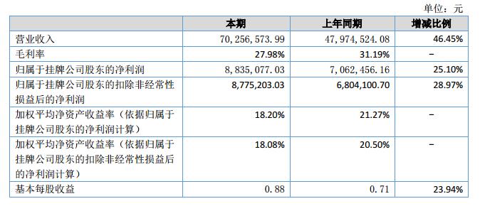報(bào)告期內(nèi),公司實(shí)現(xiàn)營業(yè)收入70,256,573.99元,同比增長(zhǎng)了46.45%。營業(yè)成本同比增長(zhǎng)53.28%實(shí)現(xiàn)凈利潤8,835,077.03元,同比增長(zhǎng)25.1%。?