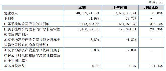 公司實現(xiàn)營業(yè)收入40,339,211.91元,同比增長20.03%,;公司實現(xiàn)歸屬于掛牌公司股東凈利潤1,473,883.86元,同比增長316.12%。