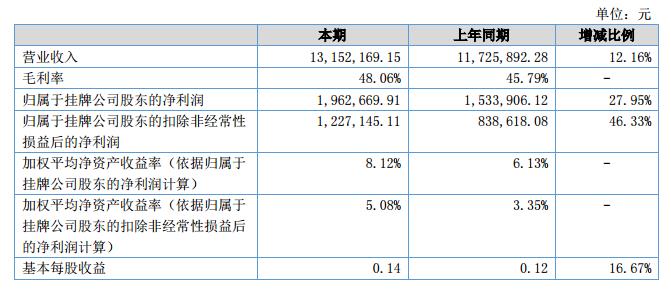 報告期,公司實現(xiàn)營業(yè)收入13,152,169.15元,較上年同期增長12.16%;報告期內(nèi),公司本期毛利率為48.06%,較上年同期小幅增長;報告期內(nèi),公司凈利潤為1,962,669.91元,較上年同期增長27.95%。