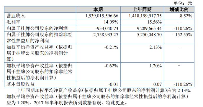 報告期內(nèi)公司實現(xiàn)營業(yè)收入153901.56萬元,比去年同期增長8.52%;實現(xiàn)歸屬于母公司股東的凈利潤-95.30萬元,比去年同期下降110.26%。?