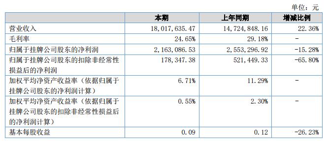 報告期內(nèi),公司實現(xiàn)營業(yè)收入1801.76萬元,比上年同期增加329.28萬元,同比增加22.36%;營業(yè)成本1357.69萬元,比上年同期增加314.93萬元,同比增長30.20%;營業(yè)利潤55.98萬元,比上年同期減少39.63萬元,同比減少41.45%;利潤總額254.46萬元,比上年同期減少44.34萬元,同比減少14.84%;凈利潤207.14萬元,比上年同期減少52.16萬元,同比減少20.11%。?