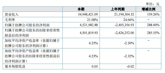 報告期內(nèi),公司實現(xiàn)營業(yè)收入5,494.84萬元,同比增長159.26%,歸屬于掛牌公司股東的凈利潤為452.20萬元,同比增長288.00%。?