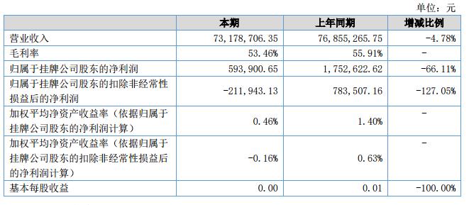 報告期內(nèi)公司實現(xiàn)營業(yè)收入73,178,706.35元,比上年同期減少4.78%,實現(xiàn)凈利潤593,900.65元,比上年同期減少66.11%?