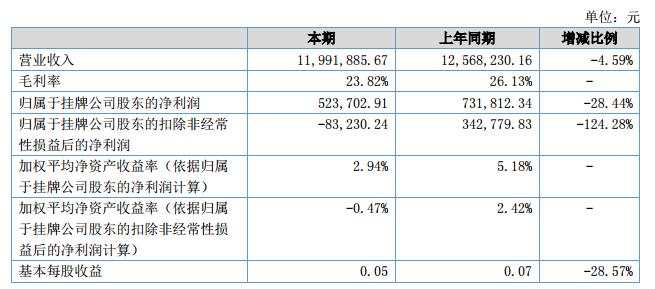 公司在報(bào)告期內(nèi)的主營業(yè)務(wù)收入為11,991,885.67元,比上年度減少576,344.49元;營業(yè)成本為9,135,766.99元,比上年度減少148,480.95元;歸屬于母公司的凈利潤為523,702.91元,比上年度減少208,109.43元。?