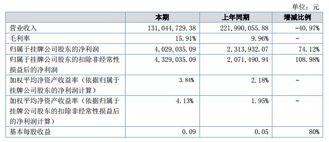 報告期內(nèi),公司實現(xiàn)營業(yè)收入13,104.47萬元,較上年同期的營業(yè)收入22,199.01萬元減少40.97%、營業(yè)利潤591.28萬元較上年同期372.17萬元增長了58.87%,凈利潤402.90萬元較上年同期205.91萬元增長了95.67%。?