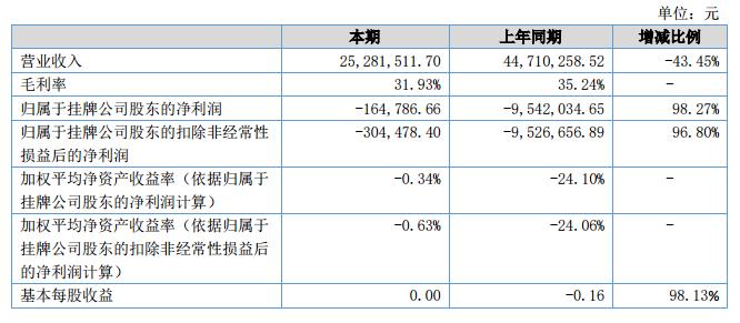 報告期內(nèi),公司實現(xiàn)營業(yè)收入2528萬元,較上年同期收入4771萬元有較大幅度的降低;凈利潤-76.7萬元,較上年同期凈利潤(-960.8萬元)大幅度減虧。