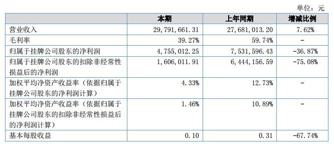 報(bào)告期內(nèi),公司實(shí)現(xiàn)營(yíng)業(yè)收入29,791,661.31元,,較上年同期增加2,110,648.11元,增幅7.62%;凈利潤(rùn)為4,755,012.25元,較上年同期減少2,776,584.18元,降幅36.87%。?