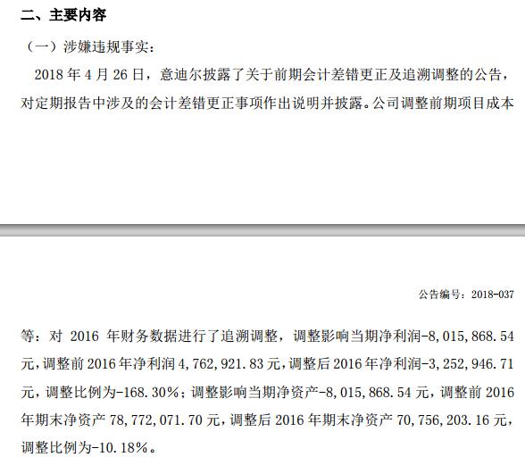 2018年4月26日,意迪爾披露了關(guān)于前期會計差錯更正及追溯調(diào)整的公告, 對定期報告中涉及的會計差錯更正事項作出說明并披露,公司調(diào)整前期項目成本等。