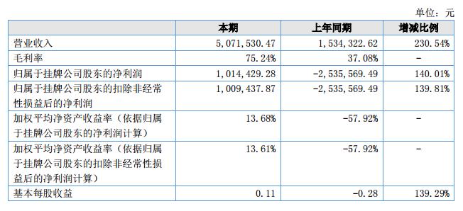 報告期內(nèi),公司實現(xiàn)營業(yè)收入507.15萬元,凈利潤101.44萬元,收入比上年同期增長230.54%利潤也由虧損轉(zhuǎn)為盈利,基本每股收益報告期為0.11元,上期為-0.28,綜合毛利率75.24%,報告期內(nèi)經(jīng)營情況呈良性趨勢發(fā)展。?