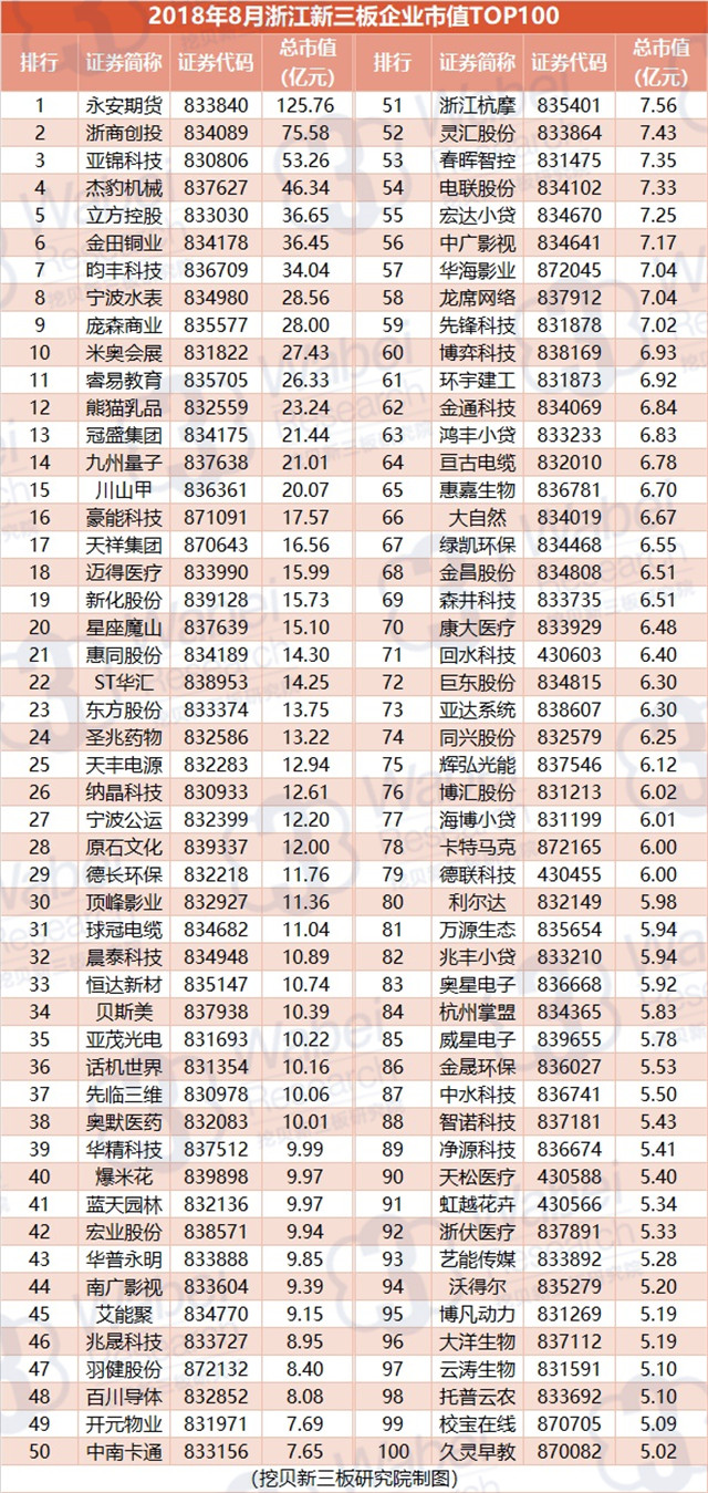 附:2018年8月浙江新三板企業(yè)市值TOP100