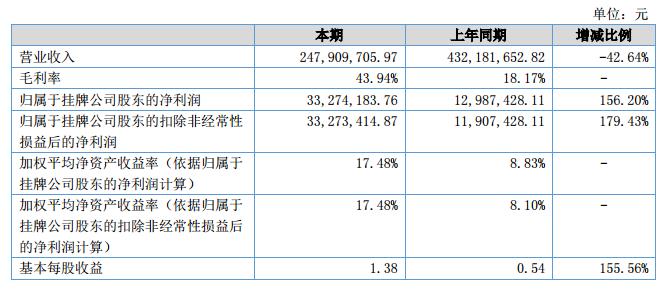 報告期內(nèi),公司實現(xiàn)營業(yè)收入247,909,705.97元,較去年同期下降了42.64%;凈利潤分別達到了33,273,414.87元,較去年同期增長了179.43%。