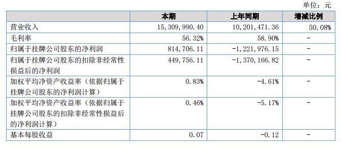 報告期內(nèi),公司實現(xiàn)營業(yè)收入15,309,990.40元,較去年同期同比增長50.08%,?凈利潤714,706.11,較去年同期同比有所增長。