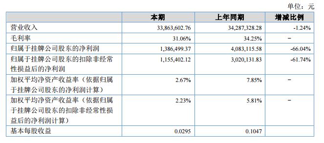 報告期內(nèi)公司實現(xiàn)營業(yè)收入3386.36萬元,較上年同期下降1.24%;營業(yè)成本為2334.62萬元,較上年同期增加3.56%;實現(xiàn)利潤總額108.43萬元,較上年同期下降75.90%;實現(xiàn)凈利潤106.44萬元,較上年同期下降72.00%,歸屬于掛牌公司股東的凈利潤為138.65萬元,較上年同期下降66.04%。?