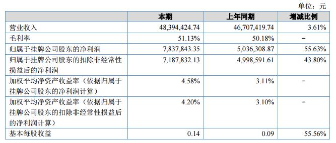 報(bào)告期內(nèi),實(shí)現(xiàn)營業(yè)收入48,394,424.74元,較上期增長3.61%,營業(yè)總成本40,207,292.46元,較上期降低了4.55%,歸屬于掛牌公司股東的凈利潤7,837,843.35元,較上期增長55.63%。?