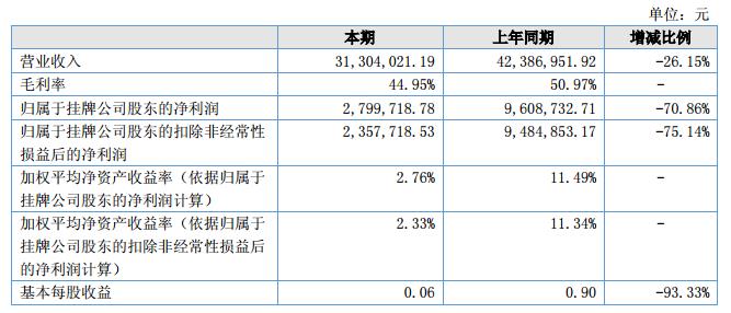 報告期內(nèi)公司實現(xiàn)營業(yè)收入31,304,021.19元,較上年同期42,386,951.92元下降26.15%;?公司實現(xiàn)凈利潤2,799,718.78元,同比增長-70.86%。