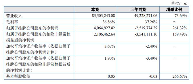 挖貝網(wǎng)9月6日,招金膜天(證券代碼:838813)近日公布的2018年半年報(bào)顯示,截至2018年6月30日,企業(yè)實(shí)現(xiàn)營(yíng)收8550.32萬(wàn)元;歸屬于掛牌公司股東的凈利潤(rùn)為406.49萬(wàn)元。