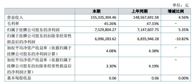 本期實現(xiàn)營業(yè)收入155,335,304.46元,比去年同期的148,567,691.58元,增長4.56%;實現(xiàn)營業(yè)成本85,032,596.88元,比上年同期78,253,978.88元,提高8.66%;實現(xiàn)歸屬于母公司所有者的凈利潤7,529,804.27元,比上年同期7,147,607.75元,增長5.35%。?