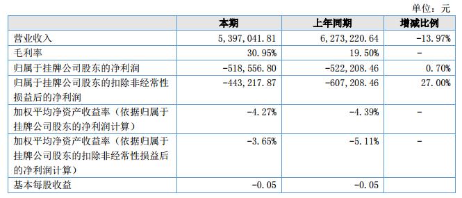 報(bào)告期內(nèi)公司實(shí)現(xiàn)銷售收入5,397,041.81元,較上年同期下降876,178.83元,同比下降13.97%;凈利潤-527,503.90元,較上年同期下降5,295.44元,同比下降1.01%。?