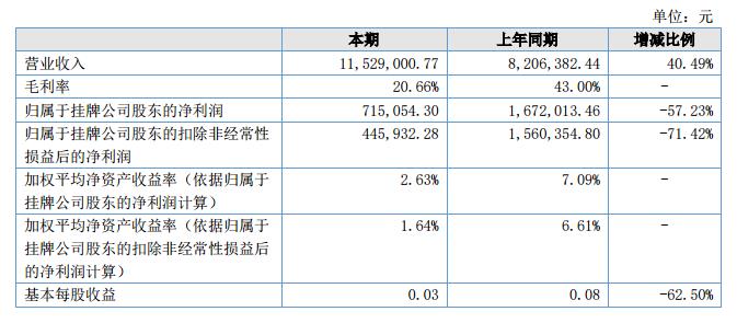 公司實(shí)現(xiàn)營業(yè)收入11,529,000.77元,較上年同期增長40.49%;實(shí)現(xiàn)凈利潤737,963.20元,較上年同期下降56.50%。?