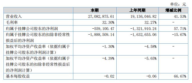 報(bào)告期內(nèi),公司實(shí)現(xiàn)營業(yè)收入27,082,875.61元,較上年同期增長41.53%;凈利潤-559,100.47元,較去年同期增長57.71%。?