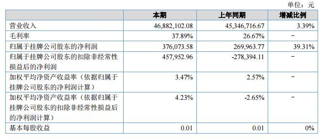 報告期內(nèi)公司實現(xiàn)營業(yè)收入46,882,102.08元,較上年同期增長3.39%;稅后凈利潤376,073.58元,較上年同期增長39.31%。?