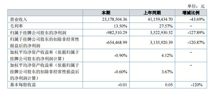 報(bào)告期內(nèi)公司實(shí)現(xiàn)營(yíng)業(yè)收入2,317.85萬(wàn)元,同比減少43.69%;公司的凈利潤(rùn)為-98.25萬(wàn)元,同比下降127.89%?。