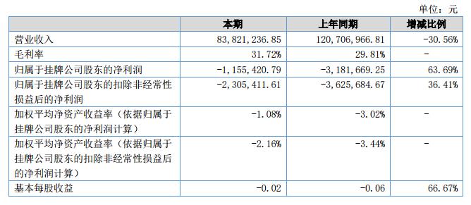 報(bào)告期末,公司實(shí)現(xiàn)營(yíng)業(yè)收入83,821,236.85元,較上年同期減少30.56%;凈利潤(rùn)虧損1,155,420.79元,較上年同期增加63.69%,凈利潤(rùn)虧損較上年同期減少的原因?yàn)楣酒陂g費(fèi)用的減少。?
