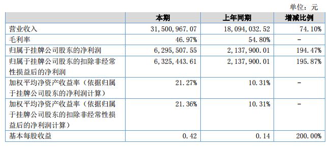 報(bào)告期內(nèi)新簽合同7000余萬元,實(shí)現(xiàn)營業(yè)收入3,150.10萬元,比去年同期1809.40萬元增長了74.10%,歸屬于掛牌公司股東凈利潤增加424.77萬元,比去年同期增長207.43%。資產(chǎn)總額增長7.36%,負(fù)債總額下降20.08%,凈資產(chǎn)增長23.80%。?