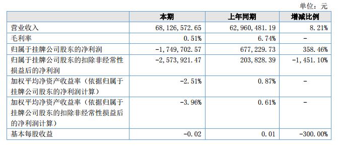 報(bào)告期內(nèi),公司實(shí)現(xiàn)營(yíng)業(yè)收入68,126,572.65元,較去年增長(zhǎng)8.21%,其中燃料油銷(xiāo)售收入63,348,951.71元,占總收入92.99%;凈利潤(rùn)虧損1,749,702.57元,較上年增加虧損2,426,932.30元。?