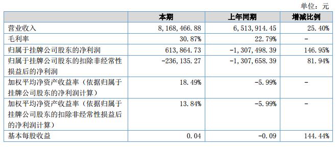 報告期內(nèi),公司營業(yè)收入816.85萬元,營業(yè)收入較上期增加165.46萬元,增長比例25.40%;凈利潤61.39萬元,同比增長146.95%。