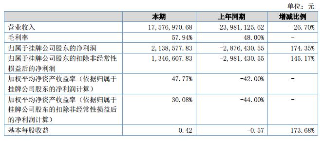 報(bào)告期內(nèi),公司實(shí)現(xiàn)營(yíng)業(yè)收入17,576,970.68元,較去年同期下降26.70%;公司實(shí)現(xiàn)凈利潤(rùn)2,138,577.83元,同比增長(zhǎng)174.35%?。