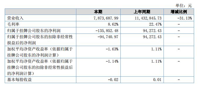 報(bào)告期內(nèi)公司營(yíng)業(yè)收入7,873,687.99元,較去年同期有所下降;營(yíng)業(yè)成本為7,195,047.18元,與上年同期相比減少1,669,313.02元,降幅18.83%?;凈利潤(rùn)為-135,852.48元?。