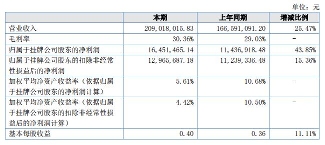 報告期內(nèi),公司經(jīng)營保持良性快速增長,實現(xiàn)營業(yè)收入209,018,015.83元,較上年同期增長25.47%;凈利潤實現(xiàn)16,589,934.23元,比上年同期增長45.06%。?