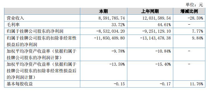 報(bào)告期內(nèi)公司營業(yè)收入859.18萬元,較上年同期減少28.59%;歸屬于母公司所有者的凈利潤-853.20萬元,較上年同期增長7.77%。