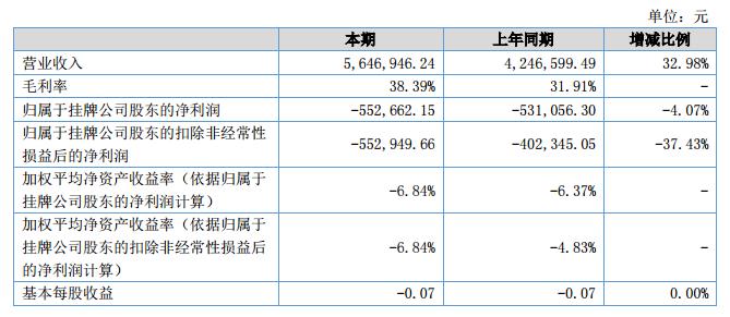 報告期內(nèi),公司實(shí)現(xiàn)營業(yè)收入5,646,946.24元,其中主營業(yè)務(wù)收入5,646,946.24元,較上年同期增長了32.97%,歸屬于掛牌公司股東的凈利潤-552,662.15元,較上年同期減少了4.07%。?