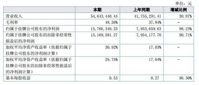 報告期內(nèi)公司實現(xiàn)營業(yè)收入約5464.34萬元,同比增長30.87%,歸屬于掛牌公司股東的凈利潤約1576.63萬元,同比增長98.23%。?