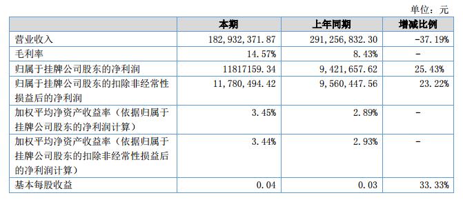 報(bào)告期內(nèi),公司營業(yè)收入為18,293.24萬元,同比減少37.19%,營業(yè)成本為15,628.08萬元,同比減少41.40%;公司實(shí)現(xiàn)凈利潤1,181.72萬元,較上年同期增長25.43%。?