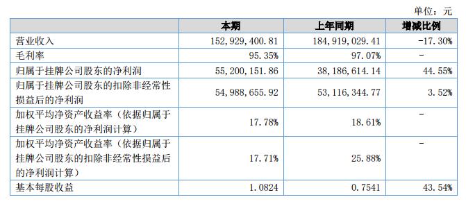 報告期內(nèi)公司實現(xiàn)營業(yè)收入15,292.94萬元,較去年同期下降17.30%,同時公司實現(xiàn)凈利潤5,520.02萬元,同比增長44.55%。?