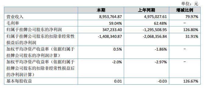報(bào)告期內(nèi)公司完成營(yíng)業(yè)收入895.38萬元,同比增長(zhǎng)79.97%;營(yíng)業(yè)成本366.79萬元,凈利潤(rùn)31.08萬元,同比增長(zhǎng)123.6%;經(jīng)營(yíng)活動(dòng)產(chǎn)生的現(xiàn)金流量?jī)纛~-296.23萬元。?