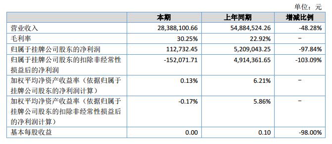 報告期內(nèi),公司實現(xiàn)營業(yè)收入2,838.81萬元,較上年同期下降48.28%;利潤總額為17.75萬元,較上年同期下降97.14%;歸屬于掛牌公司股東的凈利潤為11.27萬元,較上年同期下降97.84%。