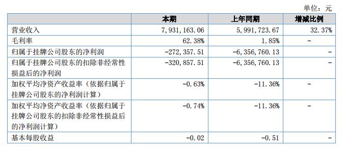 報告期內(nèi)公司實現(xiàn)營業(yè)收入7,931,163.06元,較上年同期相比增長32.37%;利潤總額為-171,904.36元,凈利潤為-272,357.51元,較上年相比虧損減少。?