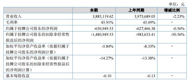 報(bào)告期內(nèi)公司實(shí)現(xiàn)營(yíng)業(yè)收入3,885,119.62元,同比增長(zhǎng)-2.23%;實(shí)現(xiàn)凈利潤(rùn)-630,949.53元,毛利率45.91%。資產(chǎn)總額為12,883,252.91元,同比增長(zhǎng)-5.45%。?